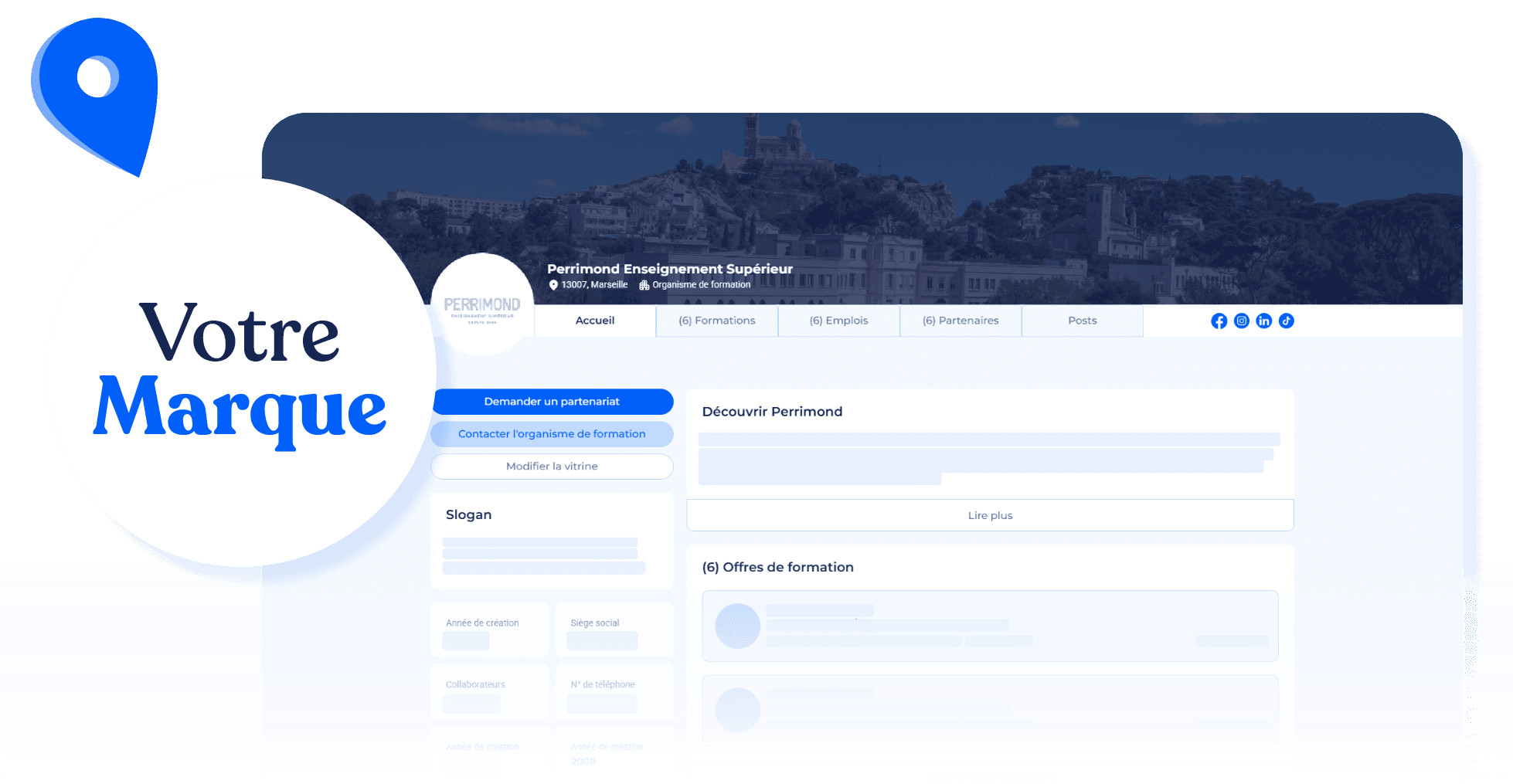 Chaque établissement dispose d’une page dédiée avec logo, bannière, actualités et partenaires.