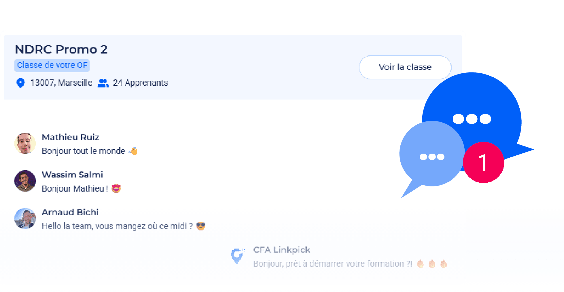 Reliez vos équipes, vos enseignants, vos étudiants et vos partenaires dans un fil d’échanges clair et contextualisé. Chaque conversation est associée à une classe, une session ou une entreprise.